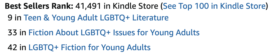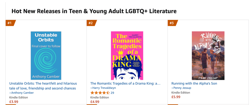 Unstable Orbits preorders started with a bang: for a while the book was top of the Hot New Releases list in Teen & Young Adult LGBTQ+ Literature, and reached #9 in the bestseller list for Teen & Young Adult LGBTQ+ Literature (these are for Amazon UK). But preorders have dropped off now — not too surprising. I’m hoping they’ll spike again once the book has a cover.