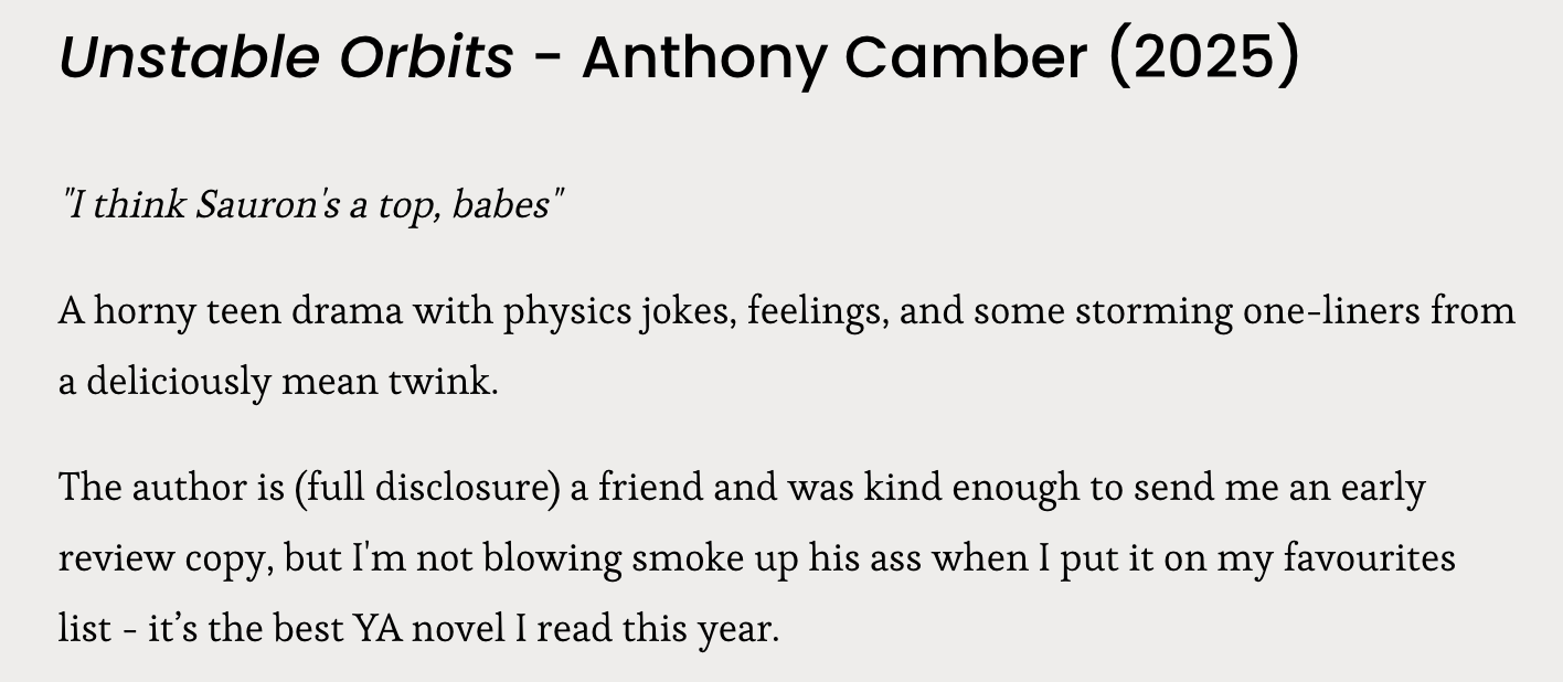 I’ve paused all direct promotion via social media or advertising for now. I spent most of 2025 standing on virtual street corners honking my horn, and it’s time-consuming as well as not being my natural habitat, or particularly effective. I’ll resume when the audiobook is ready.